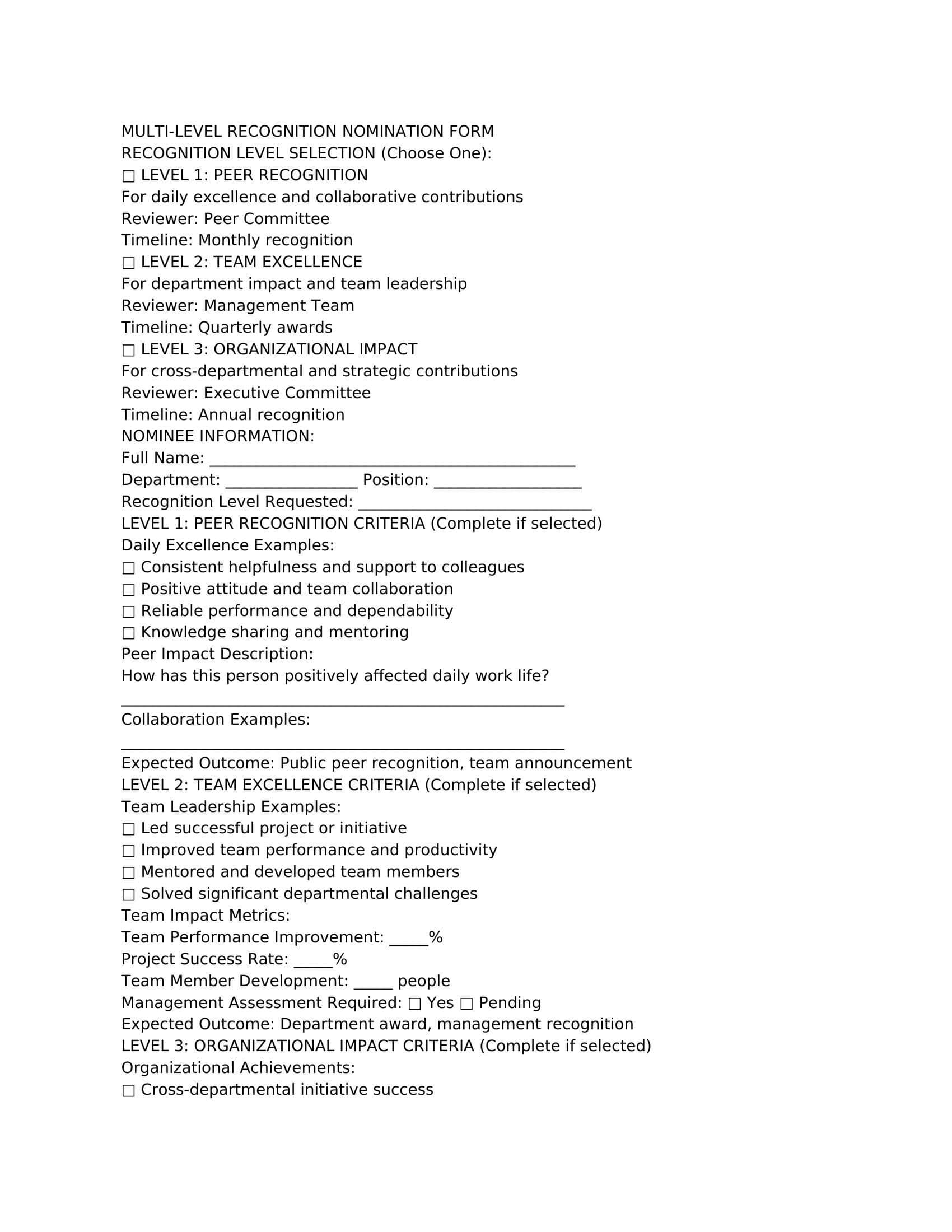 Effective employee recognition nomination forms include several critical elements that ensure comprehensive evaluation and fair consideration of all submissions. The form should clearly describe the award categories, nomination criteria, and submission requirements to help nominators provide relevant information efficiently. Essential components include nominee identification fields, detailed description sections for accomplishments, and space for supporting evidence or examples that demonstrate measurable impact on productivity and team success.